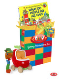 Choose Lowly Worm, Huckle Cat, or Bananas Gorilla and Richard Scarry’s “What Do People Do All Day” Hardcover Book wrapped in daffodil yellow tissue and a colorful YOTTOY gift bag. Gift bag includes a bright green satin ribbon and a hand-written personalized YOTTOY gift card.