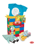 Pigeon Soft Toy, Onesie, “Don’t Let The Pigeon Drive the Bus” Onsie and Mo Willems Baby Rattle Socks wrapped in daffodil yellow tissue and a colorful YOTTOY gift bag. Gift bag includes a bright green satin ribbon and a hand-written personalized YOTTOY gift card.
