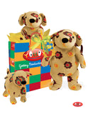 Magalina Dog 8” Soft Toy, Magalina Dog 10” Puppet, and Magalina Dog 15” Backpack Gift-Wrapped in daffodil yellow tissue and a colorful YOTTOY gift bag. Gift bag includes a bright green satin ribbon and a hand-written personalized YOTTOY gift card.