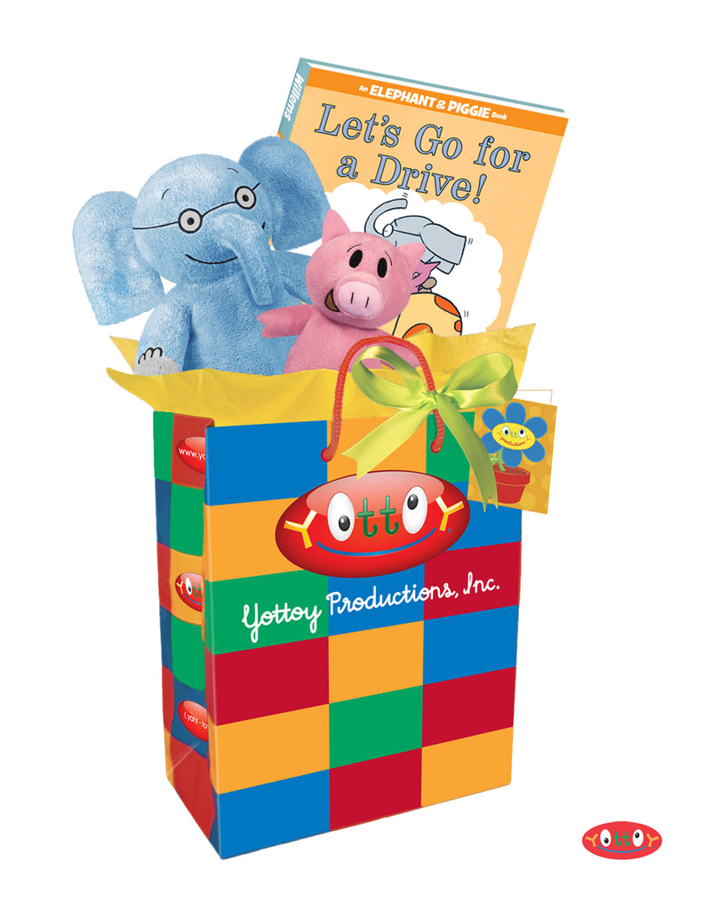 Elephant & Piggie Soft Toy Pair and “Let’s Go For a Drive” Hardcover Book wrapped in daffodil yellow tissue and a colorful YOTTOY gift bag. Gift bag includes a bright green satin ribbon and a hand-written personalized YOTTOY gift card.