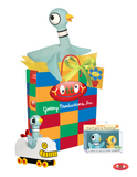 Pigeon Soft Toy, The Pigeon in Putt Putt Car, and The Pigeon & Duckling Finger Puppets wrapped in daffodil yellow tissue and a colorful YOTTOY gift bag. Gift bag includes a bright green satin ribbon and a hand-written personalized YOTTOY gift card.